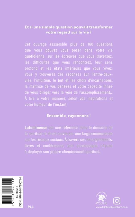 Cet ouvrage rassemble plus de 160 questions que vous pouvez vous poser dans votre vie quotidienne, sur les épreuves que vous traversez, les difficultés que vous rencontrez, leur sens profond et les états intérieurs que vous vivez. Vous y trouverez des réponses sur l’entre-deuxvies, l’intuition, le but et les choix d’incarnations, la maîtrise de vos pensées et votre capacité innée de vous diriger vers la voie de l’accomplissement... À lire à votre manière, selon vos inspirations et votre humeur de l’instant.