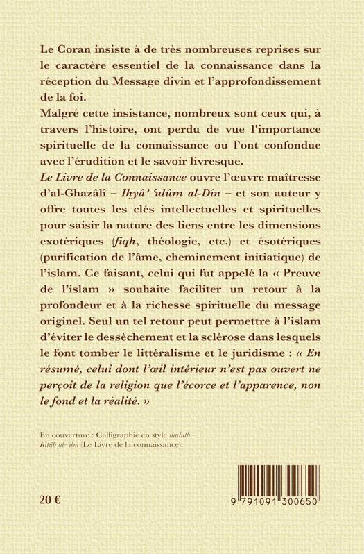 Le Coran insiste à de très nombreuses reprises sur le caractère essentiel de la connaissance dans la réception du Message divin et l’approfondissement de la foi. Malgré cette insistance, nombreux sont ceux qui, à travers l’histoire, ont perdu de vue l’importance spirituelle de la connaissance ou l’ont confondue avec l’érudition et le savoir livresque. Le Livre de la Connaissance ouvre l’œuvre maîtresse d’al-Ghazâlî – Iḥyâʾ ʿulûm al-Dîn – et son auteur y offre toutes les clés intellectuelles et spirituelles pour saisir la nature des liens entre les dimensions exotériques (fiqh, théologie, etc.) et ésotériques (purification de l’âme, cheminement initiatique) de l’islam. Ce faisant, celui qui fut appelé la « Preuve de l’islam » souhaite faciliter un retour à la profondeur et à la richesse spirituelle du message originel. Seul un tel retour peut permettre à l’islam d’éviter le dessèchement et la sclérose dans lesquels le font tomber le littéralisme et le juridisme : « En résumé, celui dont l’œil intérieur n’est pas ouvert ne perçoit de la religion que l’écorce et l’apparence, non le fond et la réalité. »