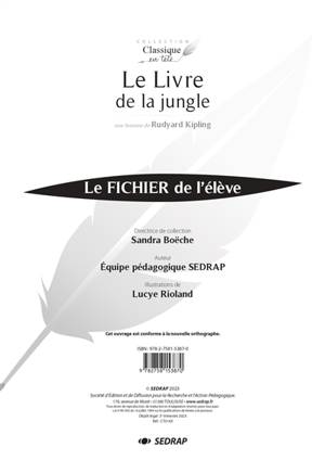 L’ouvrage « Le Livre de la jungle » de Rudyard Kipling– collection « Classique en tête » est accompagné d’un fichier pédagogique de 20 fiches de lecture suivie à photocopier, contenant des activités autour du texte, des personnages, du temps et de la narration. Certaines fiches sont également dédiées à la production écrite ou à l’étude de la langue.