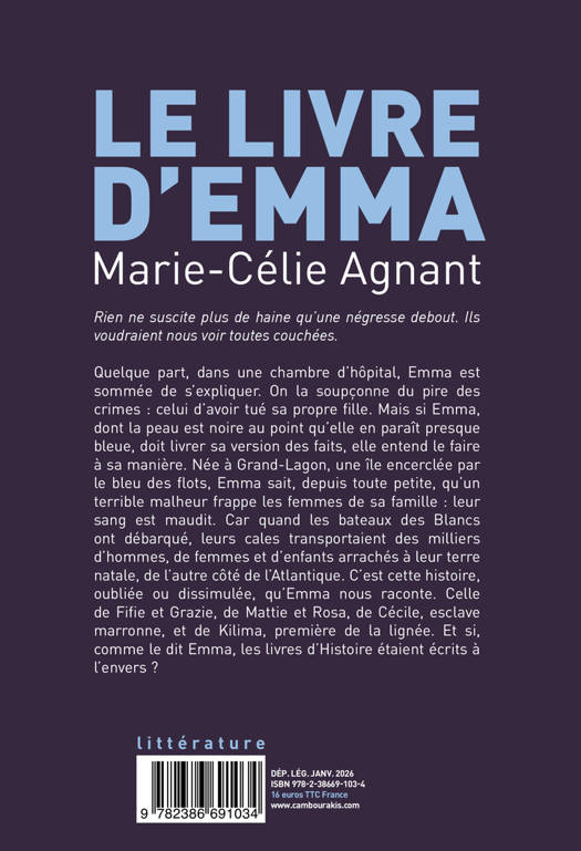 Quelque part, dans une chambre d'hôpital, Emma est sommée de s'expliquer. On la soupçonne du pire des crimes : celui d'avoir tué sa propre fille. Mais si Emma, dont la peau est noire au point qu'elle en paraît presque bleue, doit livrer sa version des faits, elle entend le faire à sa manière. Née à Grand-Lagon, une île encerclée par le bleu des flots, Emma sait, depuis toute petite, qu'un terrible malheur frappe les femmes de sa famille : leur sang est maudit. Car quand les bateaux des Blancs ont débarqué, leurs cales transportaient des milliers d'hommes, de femmes et d'enfants arrachés à leur terre natale, de l'autre côté de l'Atlantique. C'est cette histoire, oubliée ou dissimulée, qu'Emma nous raconte. Celle de Fifie et Grazie, de Mattie et Rosa, de Cécile, esclave marronne, et de Kilima, première de la lignée. Et si, comme le dit Emma, les livres d'Histoire étaient écrits à l'envers ?