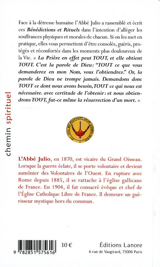 Face à la détresse humaine l'Abbé Julio a rassemblé et écrit ces Bénédictions et Rituels dans l'intention d'alléger les souffrances physiques et morales de chacun. Si on les met en pratique, elles vous permettent d'être consolés, guéris, protégés et réconfortés dans les moments plus douloureux de la Vie. " La Prière en effet peut tout, et elle obtient tout." C'est la parole de Dieu: "Tout ce que vous demanderez en mon Nom, vous l'obtiendrez." Or, la parole de Dieu ne trompe jamais. Demandons donc tout ce dont nous avons besoin, tout ce qui nous est nécessaire, avec certitude de l'obtenir, et nous obtiendrons tout, fut-ce même la résurrection d'un mort.