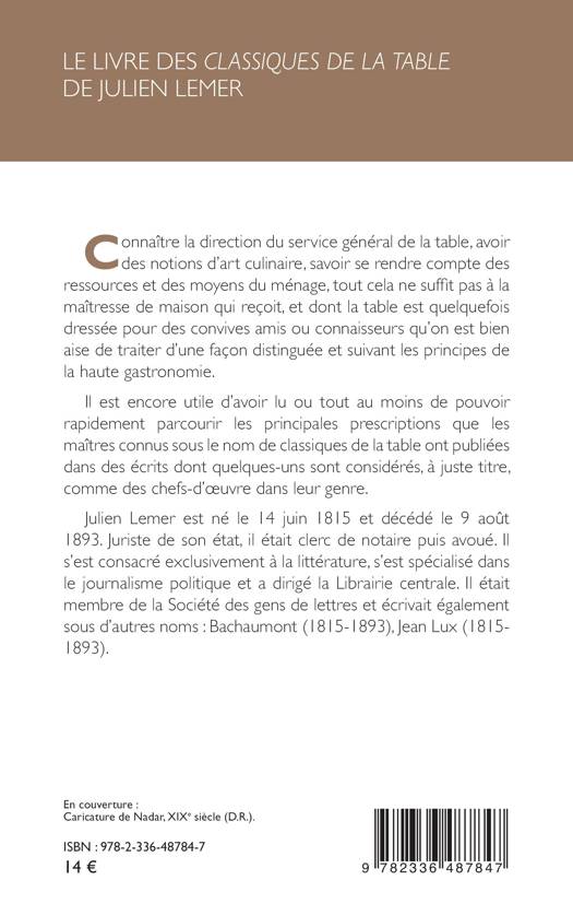 Connaître la direction du service général de la table, avoir des notions d’art culinaire, savoir se rendre compte des ressources et des moyens du ménage, tout cela ne suffit pas à la maîtresse de maison qui reçoit, et dont la table est quelquefois dressée pour des convives amis ou connaisseurs qu’on est bien aise de traiter d’une façon distinguée et suivant les principes de la haute gastronomie. Il est encore utile d’avoir lu ou tout au moins de pouvoir rapidement parcourir les principales prescriptions que les maîtres connus sous le nom de classiques de la table ont publiées dans des écrits dont quelques-uns sont considérés, à juste titre, comme des chefs-d’œuvre dans leur genre. Julien Lemer est né le 14 juin 1815, décédé le 9 août 1893. Juriste de son état, il était clerc de notaire puis avoué. Il s’est consacré exclusivement à la littérature, s’est spécialisé dans le journalisme politique et a dirigé la Librairie centrale. Il était membre de la Société des gens de lettres et écrivait également sous d’autres noms : Bachaumont (1815-1893), Jean Lux (1815-1893).