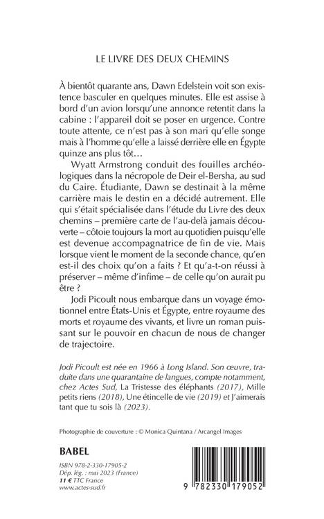 À bientôt quarante ans, Dawn Edelstein voit son existence basculer en quelques minutes. Elle est assise à bord d'un avion lorsqu'une annonce retentit dans la cabine : l'appareil doit se poser en urgence. Contre toute attente, ce n'est pas à son mari qu'elle songe mais à l'homme qu'elle a laissé derrière elle en Égypte quinze ans plus tôt... Wyatt Armstrong conduit des fouilles archéologiques dans la nécropole de Deir el-Bersha, au sud du Caire. Étudiante, Dawn se destinait à la même carrière mais le destin en a décidé autrement. Elle qui s'était spécialisée dans l'étude du Livre des deux chemins - première carte de l'au-delà jamais découverte - côtoie toujours la mort au quotidien puisqu'elle est devenue accompagnatrice de fin de vie. Mais lorsque vient le moment de la seconde chance, qu'en est-il des choix qu'on a faits ? Et qu'a-t-on réussi à préserver - même d'infime - de celle qu'on aurait pu être ? Jodi Picoult nous embarque dans un voyage émotionnel entre États-Unis et Égypte, entre royaume des morts et royaume des vivants, et livre un roman puissant sur le pouvoir en chacun de nous de changer de trajectoire.