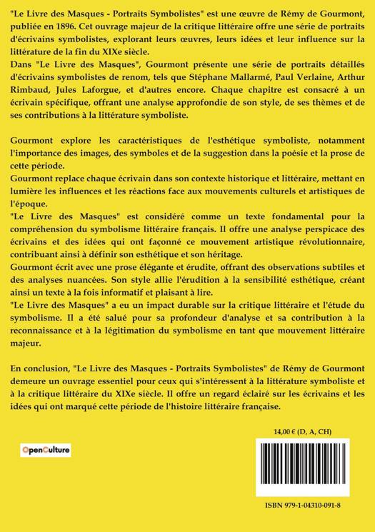 Le Livre des Masques de Remy de Gourmont est une oeuvre qui explore les figures littéraires du symbolisme à travers une série de portraits d'écrivains. Dans sa préface, Gourmont discute de la difficulté de caractériser une évolution littéraire en cours, soulignant le développement et la transformation du mouvement symboliste. Il décrit le symbolisme comme un individualisme en littérature, une liberté artistique qui s'affranchit des formules enseignées et qui tend vers le nouveau, l'étrange et le bizarre. Le livre présente des portraits de divers écrivains, chacun illustrant une facette d'évolution du symbolisme. Maurice Maeterlinck est décrit comme un poète de la douleur et de l'angoisse, tandis qu'Émile Verhaeren est présenté comme un poète halluciné, dont la poésie est marquée par la puissance et la nouveauté. Henri de Régnier est reconnu pour sa transformation d'images et sa maîtrise du vers, tandis que Francis Vielé-Griffin est salué pour sa poésie de la joie et de la nature. Stéphane Mallarmé est présenté comme une figure influente, dont l'oeuvre est marquée par une subtilité et une complexité qui ont inspiré de nombreux poètes contemporains. Albert Samain est décrit comme un poète délicat et suave, tandis que Pierre Quillard est reconnu pour sa maîtrise du verbe et sa quête de beauté. Enfin, Adolphe Retté est présenté comme un poète de la douceur et de la tendresse, dont l'oeuvre est marquée par une recherche de libération sociale et personnelle. À travers ces portraits, Gourmont offre une analyse progressive et nuancée du symbolisme, mettant en lumière la transformation et la profondeur de ce mouvement littéraire.