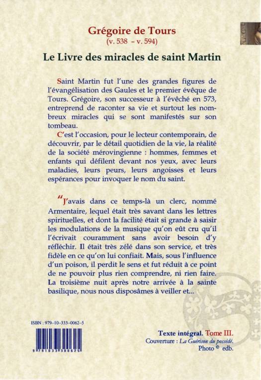 Saint Martin fut l'une des grandes figures de l'évangélisation des Gaules et le premier évêque de Tours. Grégoire, son successeur à l'évêché en 573, entreprend de raconter sa vie et surtout les nombreux miracles qui se sont manifestés sur son tombeau.