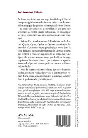 «Le Livre des Reines» est une saga familiale qui s'étend sur quatre générations de femmes prises dans le tourbillon tragique des guerres intestines au Moyen-Orient - au coeur de territoires de souffrance, du génocide arménien au conflit israélo-palestinien, en passant par les luttes entre chrétiens et musulmans au Liban et en Syrie.