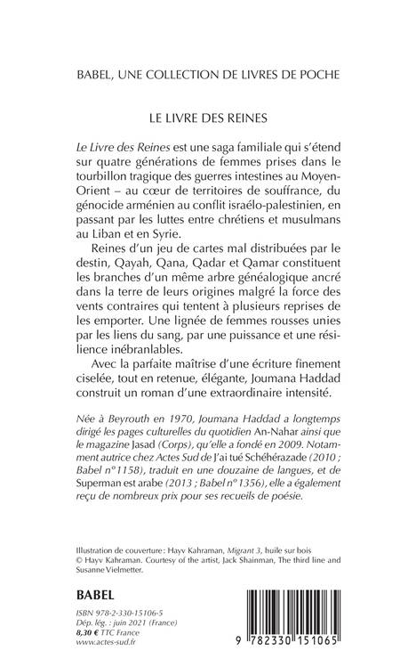 "Le Livre des Reines" est une saga familiale qui s'étend sur quatre générations de femmes prises dans le tourbillon tragique des guerres intestines au Moyen-Orient - au coeur de territoires de souffrance, du génocide arménien au conflit israélo-palestinien, en passant par les luttes entre chrétiens et musulmans au Liban et en Syrie. Reines d'un jeu de cartes mal distribuées par le destin, Qayah, Qana, Qadar et Qamar constituent les branches d'un même arbre généalogique ancré dans la terre de leurs origines malgré la force des vents contraires qui tentent à plusieurs reprises de les emporter. Une lignée de femmes rousses unies par les liens du sang, par une puissance et une résilience inébranlables. Avec la parfaite maîtrise d'une écriture finement ciselée, tout en retenue, élégante, Joumana Haddad construit un roman d'une extraordinaire intensité.