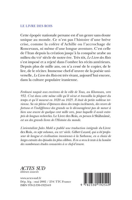 Cette épopée nationale persane, composée au Xe siècle, est d'un genre sans doute unique au monde. C'est l'histoire de l'Iran depuis la création jusqu'à la conquête arabe au milieu du VIIe siècle. Immense chef-d'oeuvre de la poésie universelle, "Le Livre des Rois" est très vivant, aujourd'hui encore, dans la culture populaire iranienne.