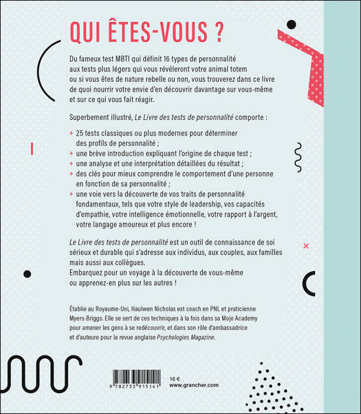 Qui êtes-vous ? Du fameux test MBTI qui définit 16 types de personnalité aux tests plus légers qui vous révéleront votre animal totem ou si vous êtes de nature rebelle ou non, vous trouverez dans ce livre de quoi nourrir votre envie d’en découvrir davantage sur vous-même et sur ce qui vous fait réagir. Superbement illustré, Le Livre des tests de personnalité comporte : 25 tests classiques ou plus modernes pour déterminer des profils de personnalité ; une brève introduction expliquant l’origine de chaque test ; une analyse et une interprétation détaillées du résultat ; des clés pour mieux comprendre le comportement d’une personne en fonction de sa personnalité ; une voie vers la découverte de vos traits de personnalité fondamentaux, tels que votre style de leadership, vos capacités d’empathie, votre intelligence émotionnelle, votre rapport à l’argent, votre langage amoureux et plus encore ! Cet ouvrage est un outil de connaissance de soi sérieux et durable qui s’adresse aux individus, aux couples, aux familles mais aussi aux collègues. Embarquez pour un voyage à la découverte de vous-même ou apprenez-en plus sur les autres !