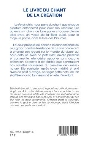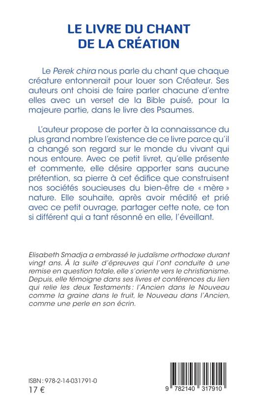 Le Perek chira nous parle du chant que chaque créature entonnerait pour louer son Créateur. Ses auteurs ont choisi de faire parler chacune d'entre elles avec un verset de la Bible puisé, pour la majeure partie, dans le livre des Psaumes. L'auteur propose de porter à la connaissance du plus grand nombre l'existence de ce livre parce qu'il a changé son regard sur le monde du vivant qui nous entoure. Avec ce petit livret, qu'elle présente et commente, elle désire apporter sans aucune prétention, sa pierre à cet édifice que construisent nos sociétés soucieuses du bien-être de mère nature. Elle souhaite, après avoir médité et prié avec ce petit ouvrage, partager cette note, ce ton si différent qui a tant résonné en elle, l'éveillant.