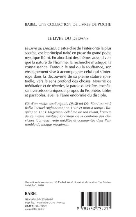 "Le Livre du Dedans", c'est-à-dire de l'intériorité la plus profonde, est le principal traité en prose du grand poète mystique Rûmî, qui fonda dans l'Anatolie du XIIIe siècle la confrérie des derviches tourneurs.