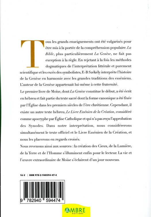 Tous les grands enseignements ont été vulgarisés pour être mis à la portée de la compréhension populaire. La Bible, plus particulièrement la Genèse, ne fait pas exception à la règle. En rejetant à la fois les méthodes dogmatiques de l'interprétation littérale et purement scientifique et les excès des symbolistes, E-B Székély interprète l'histoire de la Genèse en harmonie avec les grandes traditions des esséniens. L'auteur de la Genèse appartenait lui-même à cette fraternité. Le premier livre de Moïse, dont la Genèse constitue le début, a été écrit en hébreu et fait partie du texte sacré dont la forme canonique a été fixée par l'Église dans les premiers siècles de l'ère chrétienne. Cependant, il existe un autre texte hébreu, le Livre Essénien de la Création, considéré comme apocryphe par Église Catholique et qui n'a pas reçu l'approbation des Synodes. Dans notre interprétation, nous considérerons simultanément le texte officiel et le Livre Essénien de la Création, et nous les placerons en regards croisés. Nous revenons ainsi aux sources : la création des Cieux, de la Lumière, de la Terre et de l’Homme s’illuminent enfin pour le lecteur. La vie et l’oeuvre extraordinaire de Moïse s’éclairent d’un jour nouveau.