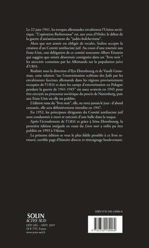 Réalisée sous la direction d'Ilya Ehrenbourg et de Vassili Grossman, cette relation "sur l'extermination scélérate des Juifs par les envahisseurs fascistes allemands dans les régions provisoirement occupées de l'URSS et dans les camps d'extermination en Pologne pendant la guerre de 1941-1945" est assez avancée en 1945 pour être envoyée au procureur soviétique du procès de Nuremberg, puis aux Etats-Unis où elle est publiée.