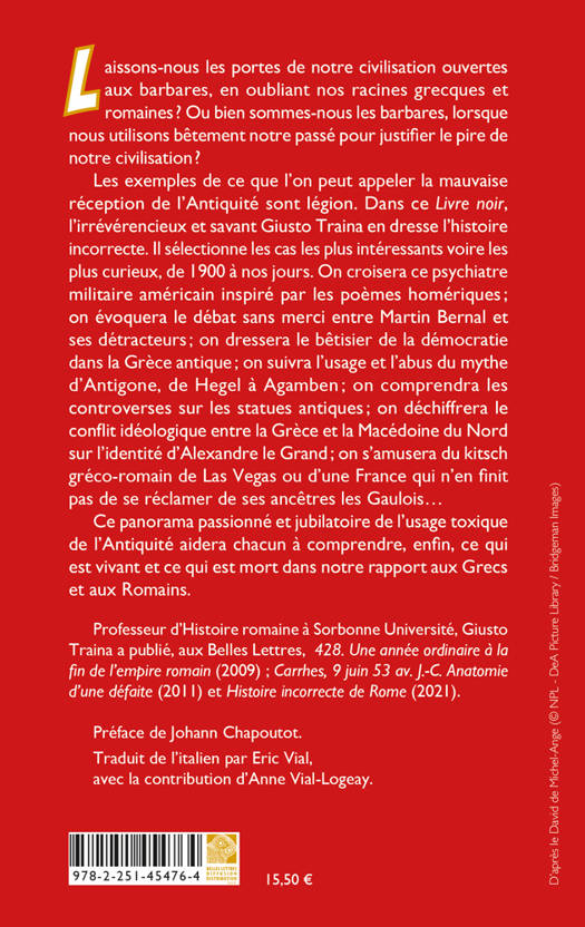 Laissons-nous les portes de notre civilisation ouvertes aux barbares, en oubliant nos racines grecques et romaines ? Ou bien sommes-nous les barbares, lorsque nous utilisons betement notre passe pour justifier le pire de notre civilisation ? Les exemples de ce que l'on peut appeler la mauvaise reception de l'Antiquite sont legion. Dans ce Livre noir, l'irreverencieux et savant Giusto Traina en dresse l'histoire incorrecte. Il selectionne les cas les plus interessants voire les plus curieux, de 1900 a nos jours. On croisera ce psychiatre militaire americain inspire par les poemes homeriques; on evoquera le debat sans merci entre Martin Bernal et ses detracteurs; on dressera le betisier de la democratie dans la Grece antique; on suivra l'usage et l'abus du mythe d'Antigone, de Hegel a Agamben; on comprendra les controverses sur les statues antiques; on dechiffrera le conflit ideologique entre la Grece et la Macedoine du Nord sur l'identite d'Alexandre le Grand; on s'amusera du kitsch greco-romain de Las Vegas ou d'une France qui n'en finit pas de se reclamer de ses ancetres les Gaulois Ce panorama passionne et jubilatoire de l'usage toxique de l'Antiquite aidera chacun a comprendre, enfin, ce qui est vivant et ce qui est mort dans notre rapport aux Grecs et aux Romains.
