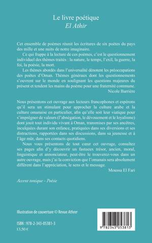 Cet ensemble de poèmes réunit les écritures de six poètes du pays des mille et unes nuits de notre imaginaire.Thèmes généraux dont les questionnements s'ouvrent sur le monde en soulignant les questions majeures du présent et tendent les mains du poème pour une fraternité commune.