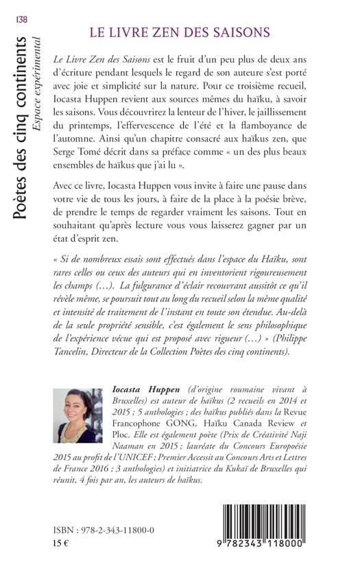 Le livre Zen des saisons est le fruit d'un peu plus de deux ans d'écriture pendant lesquels le regard de son auteure s'est porté avec joie et simplicité sur la nature. Pour ce troisième recueil, Iocasta Huppen revient aux sources même du Haïku, à savoir les saisons. Vous découvrirez la lenteur de l'hiver, le jaillissement du printemps, l'effervescence de l'été et la flamboyance de l'automne. Ainsi qu'un chapitre consacré aux haïkus zen que Serge Tomé décrit dans sa préface comme « un des plus beaux ensembles de haïkus que j'ai lu ». Avec ce livre l'auteur nous invite à faire une pause dans votre vie de tous les jours, à faire de la place à la poésie brève, de prendre le temps de regarder vraiment les saisons. Tout en souhaitant qu'après lecture vous vous laisserez gagner par un état d'esprit zen.