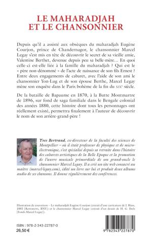 Depuis qu’il a assisté aux obsèques du maharadjah Eugène Courjon, prince de Chandernagor, le chansonnier Marcel Legay s’est mis en tête de découvrir le secret de sa vieille amie, Valentine Berthet, devenue depuis peu sa belle-mère. En quoi celle-ci est-elle liée à la famille du maharadjah ? Qui est le «père non-dénommé » de l’acte de naissance de son fils Ernest ? Entre deux engagements de cabaret, avec l’aide de son ami le chansonnier Yon-Lug et de son épouse Berthe, Marcel Legay mène son enquête dans le Paris bohème de la fin du XIXe siècle. De la bataille de Bapaume en 1870, à la Butte Montmartre de 1896, sur fond de saga familiale dans le Bengale colonial des années 1880, cette histoire dont tous les personnages ont réellement existé, permettra finalement à l’auteur de découvrir le nom de son arrière-grand-père !