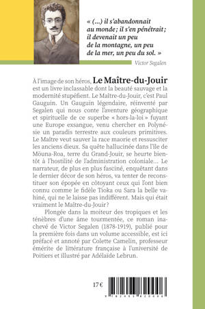 PRESENTATION DE L’OUVRAGE <br /> <br /> À l’image de son héros, Le Maître-du-Jouir est un livre inclassable dont la beauté sauvage et la modernité stupéfient. Le Maître-du-Jouir, c’est Paul Gauguin. Un Gauguin légendaire, réinventé par Segalen qui nous conte l’aventure géographique et spirituelle de ce superbe «hors-la-loi» fuyant une Europe exsangue, venu chercher en Polynésie un paradis terrestre aux couleurs primitives. Le Maître veut sauver la race maorie et ressusciter les anciens dieux. Sa quête hallucinée dans l'île de Möuna-Roa, terre du Grand-Jouir, se heurte bientôt à l'hostilité de l'administration coloniale... Le narrateur, de plus en plus fasciné, enquêtant dans le dernier décor de son héros, va tenter de reconstituer son épopée en côtoyant ceux qui l'ont bien connu comme le fidèle Tioka ou Sara la belle vahiné, qui ne le laisse pas indifférent. Mais qui était vraiment le Maître-du-Jouir? <br /> Plongée dans la moiteur des tropiques et les ténèbres d’une âme tourmentée, ce roman inachevé de Victor Segalen (1878-1919), publié pour la première fois dans un volume accessible, est ici préfacé et annoté par Colette Camelin, professeur émérite de littérature française à l’université de Poitiers et illustré par Adélaïde Lebrun.<br /> <br /> Un cahier intérieur inclut des reproductions couleurs des oeuvres de Paul Gauguin.<br /> <br /> <br /> PRESENTATION DE L’AUTEUR <br /> <br /> Victor Segalen (1878-1919) est médecin de la marine, écrivain, archéologue et ethnographe. Il séjourna à Tahiti en 1903 et 1904 et fut chargé de ramener les bagages de Gauguin, dé¬cédé peu de temps avant, des Marquises à Tahiti.<br />