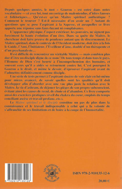 Description : Qu’est-ce qu’un Maître Spirituel ? Comment le trouver ? Est-il nécessaire d’en avoir un ? Qu’est-ce qu’un vrai disciple ? Autant de questions que se pose l’aspirant, et auxquelles ce livre apporte la réponse sans faux-fuyants ni complaisance.