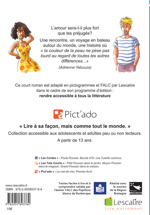 L'amour sera-t-il plus fort que les préjugés? Une rencontre, un voyage en bateau autour du monde, une histoire où "la couleur de la peau ne pèse pas lourd au regard de toutes les autres différences..." "Lire à sa façon, mais comme tout le monde.": collection accessible aux adolescents et adultes peu ou non lecteurs. Ce court roman est adapté en pictogrammes et FALC (Facile A Lire et à Comprendre) dans le cadre du programme d'édition de Lescalire: rendre accessible à tous la littérature