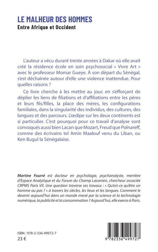 L'auteur a vécu durant trente années à Dakar où elle avait créé la résidence école en soin psychosocial Vivre Art avec le professeur Momar Gueye. À son départ du Sénégal, s'est déchaînée autour d'elle une violence inattendue. Pour quelles raisons ? Ce livre cherche à les mettre au jour, en s'efforçant de déplier les liens de filiations et d'affiliations entre les pères et leurs fils/filles, la place des mères, les configurations familiales, dans la singularité des individus, des cultures, des langues et des parcours. L'oedipe sur les deux continents est si particulier. C'est pourquoi pour ce travail d'analyse sont convoqués aussi bien Lacan que Mozart, Freud que Polnareff, comme des écrivains tel Amin Maalouf venu du Liban, ou Ken Bugul la Sénégalaise.