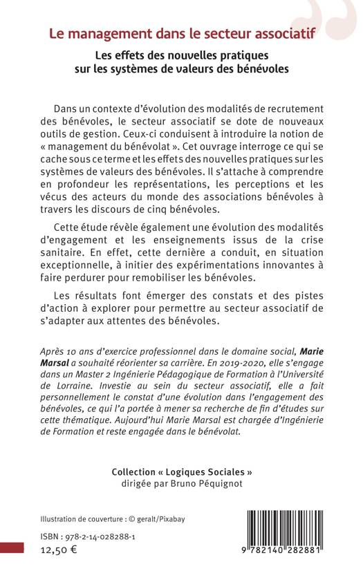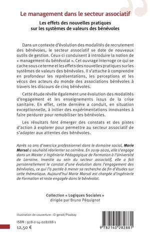 Dans un contexte d'évolution des modalités de recrutement des bénévoles, le secteur associatif se dote de nouveaux outils de gestion. Ceux-ci conduisent à introduire la notion de management du bénévolat . Cet ouvrage interroge ce qui se cache sous ce terme et les effets des nouvelles pratiques sur les systèmes de valeurs des bénévoles. Il s'attache à comprendre en profondeur les représentations, les perceptions et les vécus des acteurs du monde des associations bénévoles à travers les discours de cinq bénévoles. Cette étude révèle également une évolution des modalités d'engagement et les enseignements issus de la crise sanitaire. En effet, cette dernière a conduit, en situation exceptionnelle, à initier des expérimentations innovantes à faire perdurer pour remobiliser les bénévoles. Les résultats font émerger des constats et des pistes d'action à explorer pour permettre au secteur associatif de s'adapter aux attentes des bénévoles.