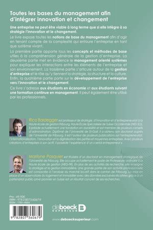La première partie apporte tous les concepts et méthodes de base utiles à la compréhension générale de la gestion d’entreprise. Ladeuxième partie met en évidence le management orienté systèmes pour expliquer les interactions entre les éléments de l’entreprise etson environnement. La troisième partie s’articule autour de la gestion d’entreprise et le rôle qu’y tiennent la stratégie, la structure et la culture.Enfin, la quatrième partie porte sur le développement de l’entreprise vers l’innovation et le changement.