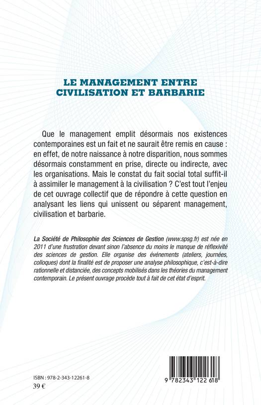 Que le management emplit désormais nos existences contemporaines est un fait, et ne saurait être remis en cause : en effet, de notre naissance à notre disparition, nous sommes désormais constamment en prise, directe ou indirecte, avec les organisations. Mais le constat du fait social total suffit-il à assimiler le management à la civilisation ? C'est tout l'enjeu de cet ouvrage collectif que de répondre à cette question en analysant les liens qui unissent ou séparent management, civilisation et barbarie.