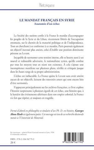 La Société des nations confie à la France le mandat d'accompagner les peuples de la Syrie et du Liban, récemment libérés de l'occupation ottomane, sur le chemin de la maturité politique et de l'indépendance. Tout en cherchant à se conformer à ce mandat, Paris poursuit également un objectif inavoué plus ancien, celui d'établir une position dominante pérenne au Levant. Incapable de surmonter cette tension interne, elle se heurte aussi à un nouvel et redoutable adversaire, le nationalisme syrien, qu'elle combat par tous les moyens tout en niant son existence. À cela s'ajoute une incompétence manifeste sur plusieurs plans, révélée et critiquée jusque dans les hauts rangs de sa propre administration. L'échec est inéluctable. La France quitte le Levant sans avoir atteint aucun de ses objectifs, laissant des souvenirs amers qui sont encore loin d'être surmontés. S'appuyant principalement sur les archives françaises, ce livre explore l'histoire surprenante à plusieurs égards de cet échec, une histoire que, à la lumière des événements ultérieurs dans son empire colonial, la France n'a fait que répéter, et toujours en tragédie.