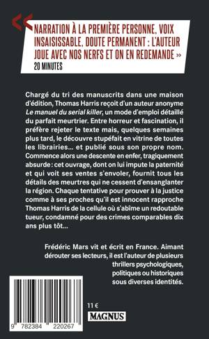 Entre horreur et fascination, il préfère rejeter le texte mais quelques semaines plus tard, le découvre stupéfait en vitrine de toutes les librairies… et publié sous son propre nom. Commence alors une descente en enfer, tragiquement absurde : cet ouvrage, dont on lui impute la paternité et qui voit ses ventes s’envoler, fournit tous les détails des meurtres qui ne cessent d’ensanglanter la région. Chaque tentative pour prouver à la justice comme à ses proches qu’il est innocent rapproche Thomas Harris de la cellule où s’abîme un redoutable tueur, condamné pour des crimes comparables dix ans plus tôt…