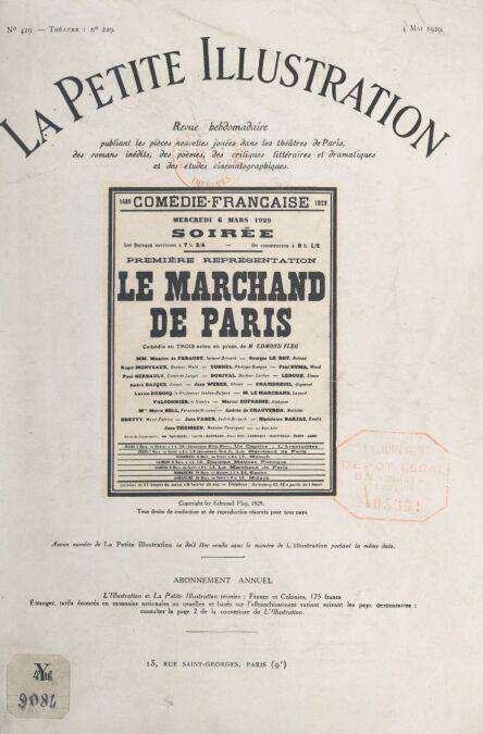 Comédie en trois actes. Le marchand de Paris a été représenté pour la première fois, le 6 mars 1929 à la Comédie-Française
