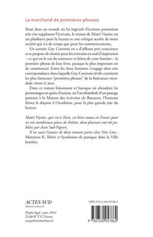 L'homme contemporain, devenu un mutant de la société de consommation, est de plus en plus obsédé par les commencements. Il a faim de tout commencer et recommencer sans cesse. Un certain Guy Courtois en a d'ailleurs fait son gagne-pain et se propose de choisir pour les écrivains en mal d'inspiration - ce qui est le cas de notre héros - la première phrase de leur livre, puisque le plus important est de commencer. Entre les deux hommes s'engage alors une correspondance dans laquelle Guy Courtois révèle dans quelles conditions les plus fameuses "premières phrases" de la littérature mondiale virent le jour.