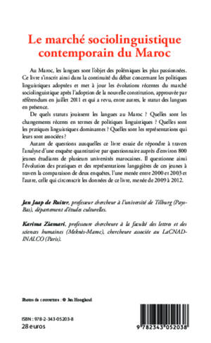 Le Maroc a connu d'importantes évolutions du marché sociolinguistique après l'adoption de la nouvelle constitution en 2011, qui a revu le statut des langues en présence (l'amazighe, l'arabe marocain, l'arabe standard, le français). De quels statuts jouissent-elles ? Quels sont les changements récents en termes de politiques linguistiques ? Quelles sont les pratiques linguistiques dominantes ? Ce livre tente de répondre à travers l'analyse d'une enquête auprès de 800 jeunes étudiants.