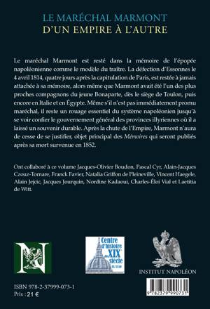 Le maréchal Marmont est resté dans la mémoire de l'épopée napoléonienne comme le modèle du traître. La défection d'Essonnes le 4 avril 1814, quatre jours après la capitulation de Paris, est restée à jamais attachée à sa mémoire, alors même que Marmont avait été l'un des plus proches compagnons du jeune Bonaparte, dès le siège de Toulon, puis encore en Italie et en Égypte. Même s'il n'est pas immédiatement promu maréchal, il reste un rouage essentiel du système napoléonien jusqu'à se voir confier le gouvernement général des provinces illyriennes où il a laissé un souvenir durable. Après la chute de l'Empire, Marmont n'aura de cesse de se justifier, objet principal des Mémoires qui seront publiés après sa mort survenue en 1852.