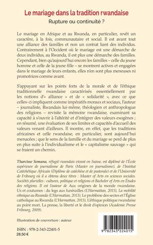 Le mariage en Afrique, et au Rwanda en particulier, revêt un caractère à la fois communautaire et social. Il est avant tout une alliance des familles et non un contrat liant des individus. S’appuyant sur les points forts de la morale et de l’éthique traditionnelle rwandaise caractérisés essentiellement par les notions d’« alliance » et de « solidarité », avec ce que celles-ci impliquent comme impératifs moraux et sociaux, l’auteur revisite la mémoire rwandaise, examinant sa capacité à s’ouvrir à l’altérité et d’intégrer des valeurs exogènes.