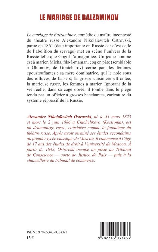 Le mariage de Balzaminov, comédie du maître incontesté du théâtre russe Alexandre Nikolaïevitch Ostrovski, met en scène l'univers de la Russie telle que Gogol l'a magnifiée. Un jeune homme est à marier, Micha, fils-à-maman, coq en pâte cerné par des femmes époustouflantes : sa mère dominatrice, qui le noie sous des effluves de baisers, la grosse cuisinière effrontée, la marieuse rusée, les femmes à marier. Ignorant de la vie réelle, dans sa cage dorée, il tombe dans le piège tendu par un officier à grosses bacchantes, caricature du système répressif de la Russie.