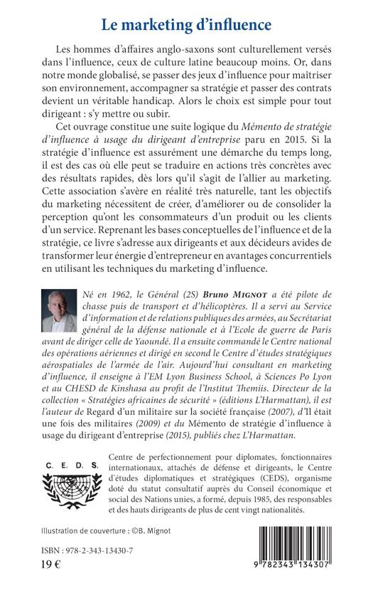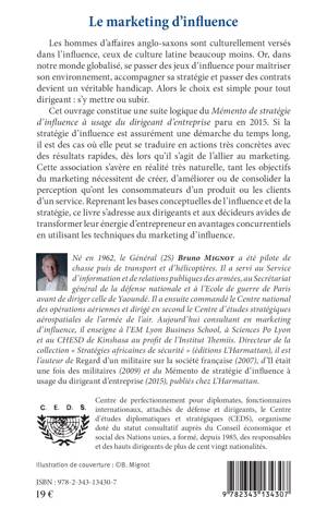 Les hommes d'affaires anglo-saxons sont culturellement versés dans l'influence, les latins beaucoup moins. Cet ouvrage fait suite au « Mémento de stratégie d'influence à usage du dirigeant d'entreprise » (2015). Associer la stratégie d'influence au marketing s'avère très naturel tant les objectifs du marketing nécessitent de créer, améliorer, consolider la perception qu'ont les consommateurs d'un produit ou les clients d'un service. Un outil pour les dirigeants d'entreprise et décideurs avides de transformer leur énergie d'entrepreneur en avantages concurrentiels.