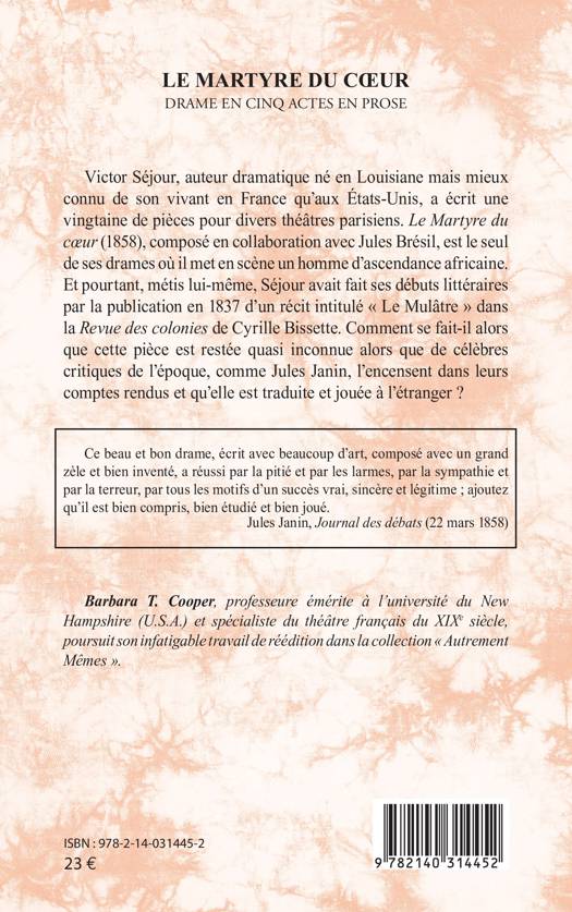 Victor Séjour, auteur dramatique né en Louisiane mais mieux connu de son vivant en France qu'aux États-Unis, a écrit une vingtaine de pièces pour divers théâtres parisiens. Le Martyre du cœur (1858), composé en collaboration avec Jules Brésil, est le seul de ses drames où il met en scène un homme d'ascendance africaine. Et pourtant, métis lui-même, Séjour avait fait ses débuts littéraires par la publication en 1837 d'un récit intitulé « Le Mulâtre » dans la Revue des colonies de Cyrille Bissette. Comment se fait-il alors que cette pièce est restée quasi inconnue alors que de célèbres critiques de l'époque, comme Jules Janin, l'encensent dans leurs comptes rendus et qu'elle est traduite et jouée à l'étranger ?