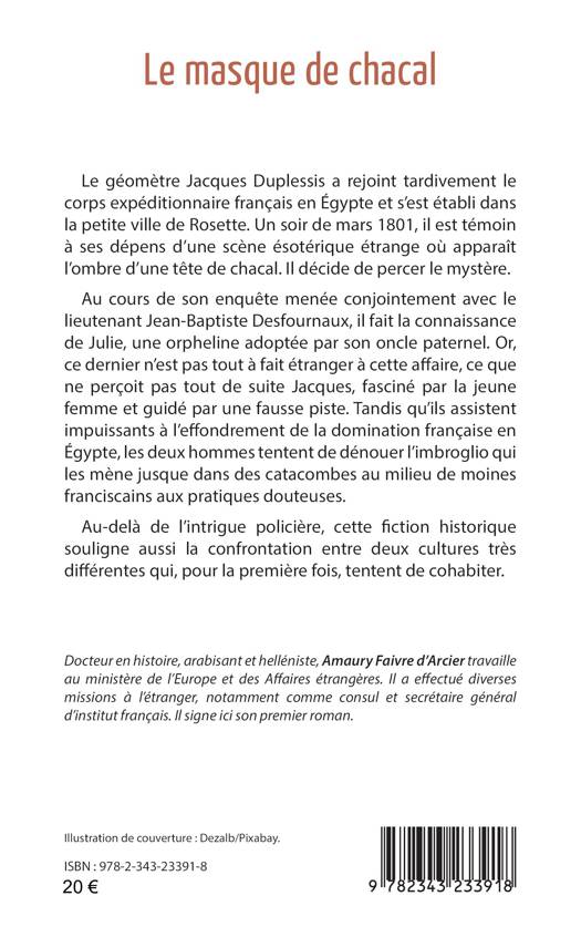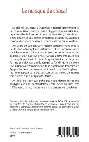Le géomètre Jacques Duplessis a rejoint tardivement le corps expéditionnaire français en Égypte et s’est établi dans la petite ville de Rosette. Un soir de mars 1801, il est témoin à ses dépens d’une scène ésotérique étrange où apparaît l’ombre d’une tête de chacal. Il décide de percer le mystère. Au cours de son enquête menée conjointement avec le lieutenant Jean-Baptiste Desfournaux, il fait la connaissance de Julie, une orpheline adoptée par son oncle paternel. Or, ce dernier n’est pas tout à fait étranger à cette affaire, ce que ne perçoit pas tout de suite Jacques, fasciné par la jeune femme et guidé par une fausse piste. Tandis qu’ils assistent impuissants à l’effondrement de la domination française en Égypte, les deux hommes tentent de dénouer l’imbroglio qui les mène jusque dans des catacombes au milieu de moines franciscains aux pratiques douteuses.