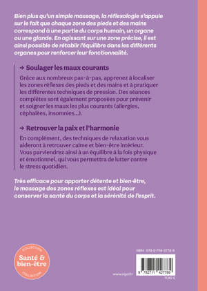 Soulager les maux courants Grâce aux nombreux pas-à-pas, apprenez à localiser les zones réflexes des pieds et des mains et à pratiquer les différentes techniques de pression. Des séances complètes sont également proposées pour prévenir et soigner les maux les plus courants (allergies, céphalées, insomnies…).