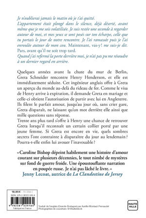 « Caroline Bishop dépeint habilement une histoire d'amour courant sur plusieurs décennies, le tout nimbé de mystères sur fond de guerre froide. Une époustouflante narration en poupée russe. Je n'ai pas lâché le livre. » Jenny Lecoat, autrice de La Clandestine de Jersey