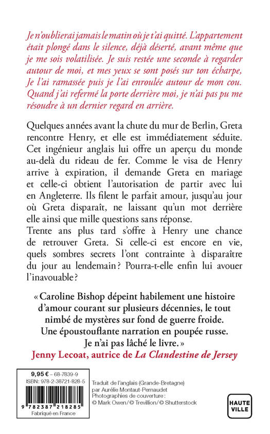 « Caroline Bishop dépeint habilement une histoire d'amour courant sur plusieurs décennies, le tout nimbé de mystères sur fond de guerre froide. Une époustouflante narration en poupée russe. Je n'ai pas lâché le livre. » Jenny Lecoat, autrice de La Clandestine de Jersey