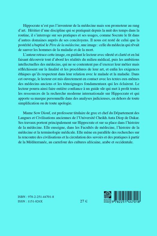 English summary: This book discusses the legacy of Hippocrates by revealing the realities of the medical environment of his time. By engaging directly with the texts of the ancient doctors and the fundamental testimonies that illuminate them, this text also examines the intellectual ambitions of doctors in this period, who did not merely practice medicine but also reflected on their art and the ethical nature of the patient-doctor relationship. French description: Hippocrate n'est pas l'inventeur de la medecine mais son promoteur au rang d'art. Heritier d'une discipline qui se pratiquait depuis la nuit des temps dans la routine, il s'interroge sur ses pratiques et ses usages, comme Socrate le fit dans d'autres domaines aupres de ses concitoyens. Il nous est reste de celui que la posterite a baptise le Pere de la medecine, une image: celle du medecin qui revait de sauver les hommes de la maladie et de la mort. L'auteur retrace cette image, en guidant le lecteur avec surete et clarte et en lui faisant decouvrir tout d'abord les realites du milieu medical, puis les ambitions intellectuelles des medecins, qui ne se contentent pas d'exercer leur metier mais reflechissent sur la finalite et les procedures de leur art, et enfin les exigences ethiques qu'ils respectent dans leur relation avec le malade et la maladie. Dans cet ouvrage, le lecteur est mis directement en contact avec les textes eux-memes des medecins anciens et les temoignages fondamentaux qui les eclairent. Le lecteur pourra ainsi faire entiere confiance a un guide sur qui met a profit toutes les ressources de la recherche moderne internationale sur Hippocrate et qui apporte sa marque personnelle dans des analyses judicieuses, en dehors de toute simplification ou de toute apologie.