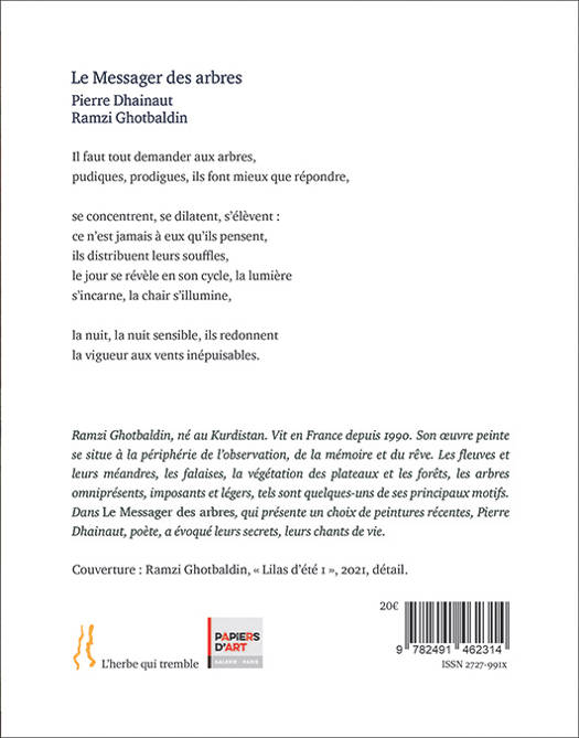 Ramzi Ghotbaldin, né au Kurdistan. Vit en France depuis 1990. Son œuvre peinte se situe à la périphérie de l’observation, de la mémoire et du rêve. Les fleuves et leurs méandres, les falaises, la végétation des plateaux et les forêts, les arbres omniprésents, imposants et légers, tels sont quelques-uns de ses principaux motifs. Dans Le Messager des arbres, qui présente un choix de peintures récentes, Pierre Dhainaut, poète, a évoqué leurs secrets, leurs chants de vie.