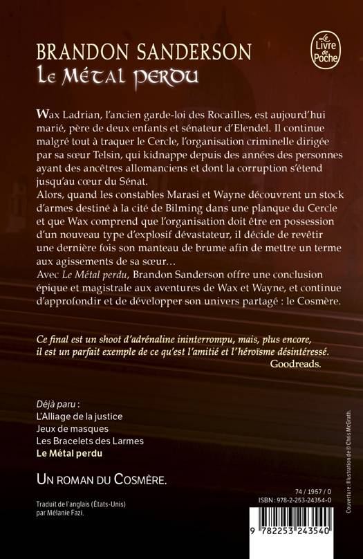 Wax Ladrian, l’ancien garde-loi des Rocailles, est aujourd’hui marié, père de deux enfants et sénateur d’Élendel. Il continue malgré tout à traquer le Cercle, l’organisation criminelle dirigée par sa sœur Telsin, qui kidnappe depuis des années des personnes ayant des ancêtres allomanciens et dont la corruption s’étend jusqu’au cœur du Sénat. Alors, lorsque dans une planque du Cercle, les constables Marasi et Wayne découvrent du trellium, un métal aux propriétés explosives provenant d’une autre planète, ainsi qu’un stock d’armes destiné à la cité de Bilming, Wax décide de revêtir une dernière fois son manteau de brume afin de mettre un terme aux agissements de sa sœur… Avec Le Métal perdu, Brandon Sanderson offre une conclusion épique et magistrale aux aventures de Wax et Wayne, et continue d’approfondir et de développer son univers partagé : le Cosmère.