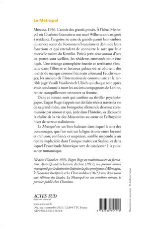 Moscou, 1936. L'année des grands procès. À l'hôtel Metropol où Charlotte Germain et son mari Wilhem sont assignés à résidence, l'angoisse ne cesse de grandir parmi les membres du service secret du Komintern brutalement démis de leurs fonctions et qui attendent de connaître le sort que leur réserve le maître du Kremlin. Petit à petit, tout autour d'eux les portes sont scellées, les résidents emmenés pour être jugés. Une étrange atmosphère feutrée et terrifiante s'installe dans l'illustre et luxueux palace où se côtoient des invités de marque comme l'écrivain allemand Feuchtwanger, les anciens de l'Internationale communiste et le terrible juge Vassili Vassilievitch Ulrich qui chaque soir, après avoir condamné à mort les anciens compagnons de Lénine, rentre tranquillement retrouver sa femme. Dans ce roman noir qui confine au thriller psychologique, Eugen Ruge s'appuie sur des faits réels à travers la vie de sa grand-mère, une bourgeoise allemande devenue communiste par amour et qui, jetée dans l'histoire, va découvrir la réalité de la vie des Moscovites au coeur de l'effroyable hiver de terreur stalinienne. Le Metropol est un livre haletant dans lequel le sort des personnages, que l'on suit sur la ligne étroite entre loyauté et trahison, confiance et suspicion, semble suspendu à un destin implacable dont l'unique maître est Staline, et dans lequel l'exactitude historique sert de catalyseur à la puissance romanesque.