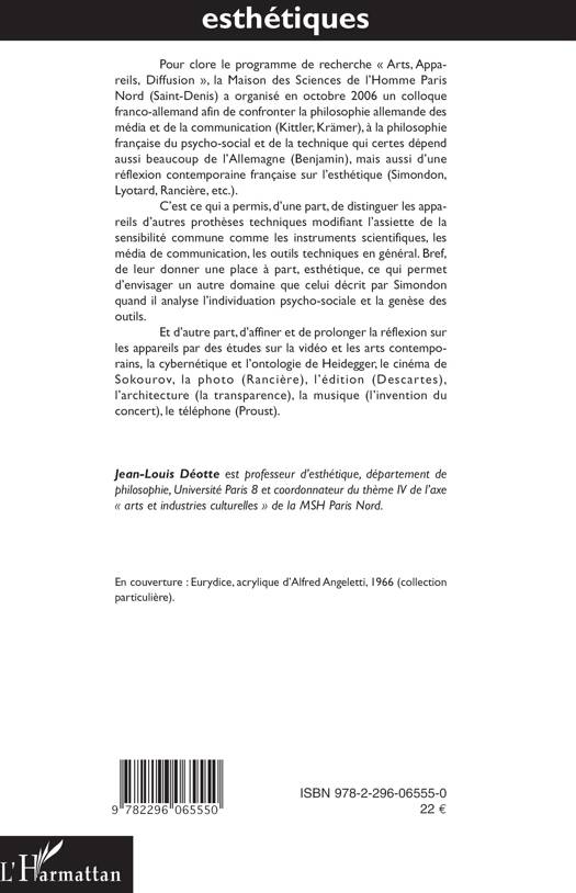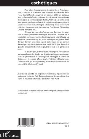 Cet ouvrage confronte la philosophie allemande des média et de la communication (Kittler, Krämer) à la philosophie française du psycho-social et de la technique ainsi qu'à la réflexion française sur l'esthétique (Simondon, Lyotard, Rancière...). Une opportunité de prolonger la réflexion sur les appareils par des études sur la vidéo, les arts contemporains, la cybernétique et l'ontologie de Heidegger, le cinéma de Sokourov, la photo (Rancière), l'édition (Descartes), l'architecture (la transparence), la musique (l'invention du concert), le téléphone (Proust).