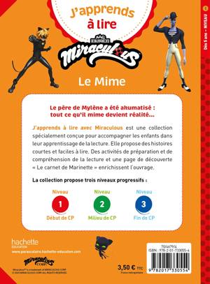 Le père de Mylène a été akumatisé : tout ce qu’il mime devient réalité… J’apprends à lire avec Miraculous est une collection spécialement conçue pour accompagner les enfants dans leur apprentissage de la lecture. Elle propose des histoires courtes et faciles à lire. Des activités de préparation et de compréhension de la lecture et une page de découverte « Le carnet de Marinette » enrichissent l’ouvrage.