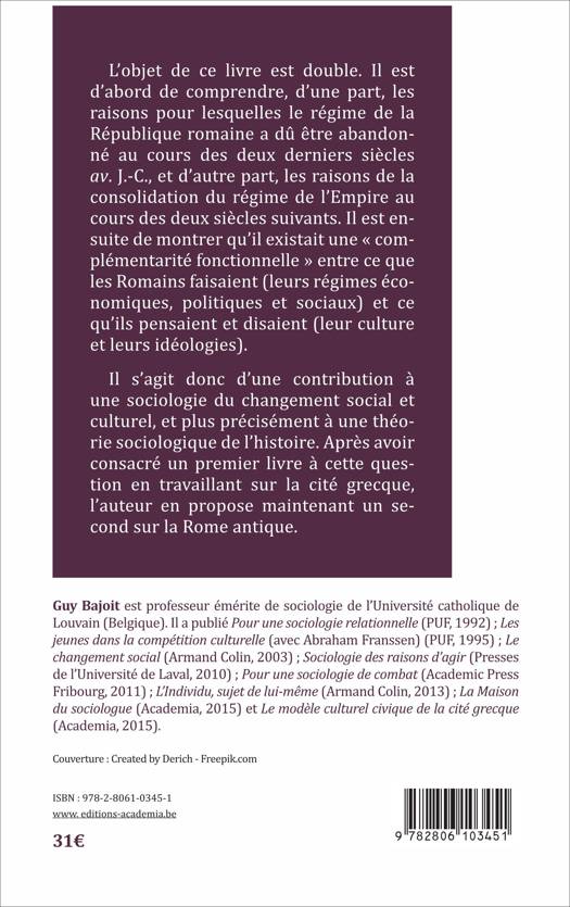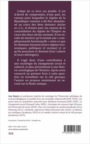 L'objet de ce livre est double. Il est d'abord de comprendre, d'une part, les raisons pour lesquelles le régime de la République romaine a dû être abandonné au cours des deux derniers siècles av. J.-C., et d'autre part, les raisons de la consolidation du régime de l'Empire au cours des deux siècles suivants. Il est ensuite de montrer qu'il existait une « complémentarité fonctionnelle » entre ce que les Romains faisaient (leurs régimes économiques, politiques et sociaux) et ce qu'ils pensaient et disaient (leur culture et leurs idéologies).