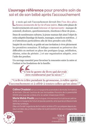 Inspiré de ces rituels, ce guide est une invitation à vivre pleinement les premières semaines. Il indique comment se préserver des difficultés en mettant en place des pratiques (yoga, méditation, shiatsu, soins du périnée...) et une organisation adaptée, avec l'aide des proches.